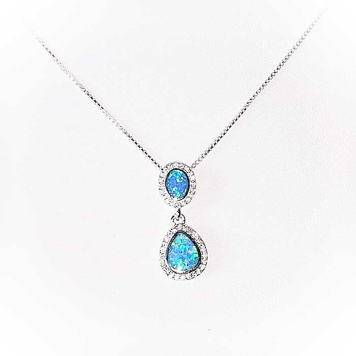 Scopri l’eleganza luminosa di questo raffinato ciondolo, realizzato con un Opale di Fuoco Blu sintetico dalla lucentezza profonda e cangiante. La pietra, simbolo di intuizione, creatività e protezione energetica, è accompagnata da una preziosa cornice di zirconi bianchi, che ne esaltano il bagliore con scintille di luce pura.